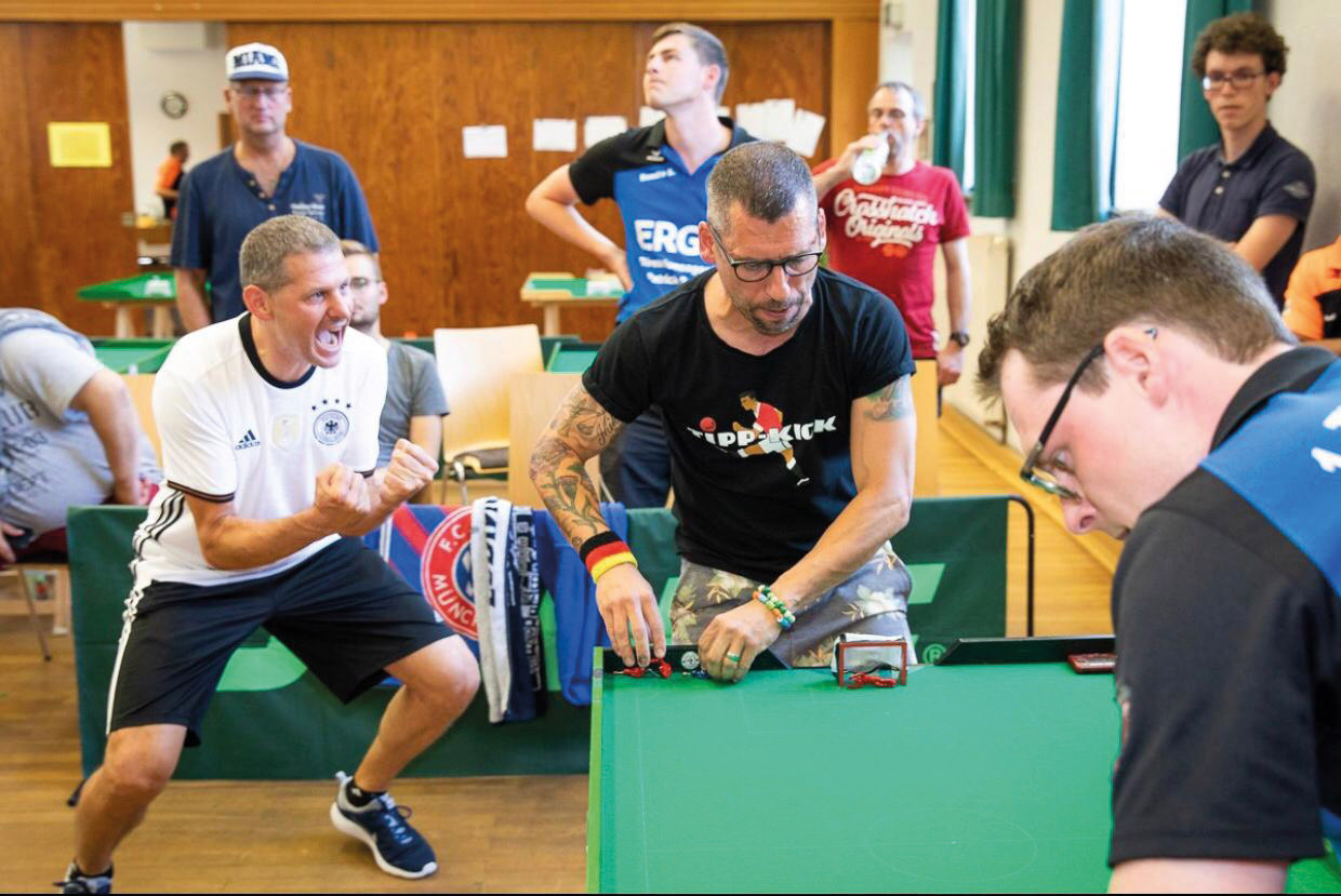 Die Tipp-Kick-Bundesliga gibt es bereits seit 1973. Sie ist die höchste deutsche Spielklasse und wird vom Deutschen Tipp-Kick-Verband (DTKV) organisiert. Gespielt wird in Mannschaften, meist vier gegen vier, die während einer Saison gegeneinander antreten. Für Benjamin liegt der Reiz aber nicht nur im sportlichen Wettbewerb: „Da sind einfach richtig gute Jungs dabei, und über die Jahre hat sich eine tolle Community gebildet. Oft fährt man auch hin, um die Leute aus ganz Deutschland wiederzusehen. Aber natürlich gibt es auch packende Duelle mit richtig viel Nervenkitzel.“ Der TKC 71 Hirschlanden zählt dabei zu den erfolgreichsten Vereinen im deutschen Tipp-Kick. Seit den 1990er-Jahren spielt der Club in der Bundesliga und hat sich dort als feste Größe etabliert. Seine beeindruckende Bilanz umfasst mehrere Deutsche Mannschaftsmeistertitel, darunter ein bemerkenswerter Hattrick in den Jahren 2022 bis 2024.