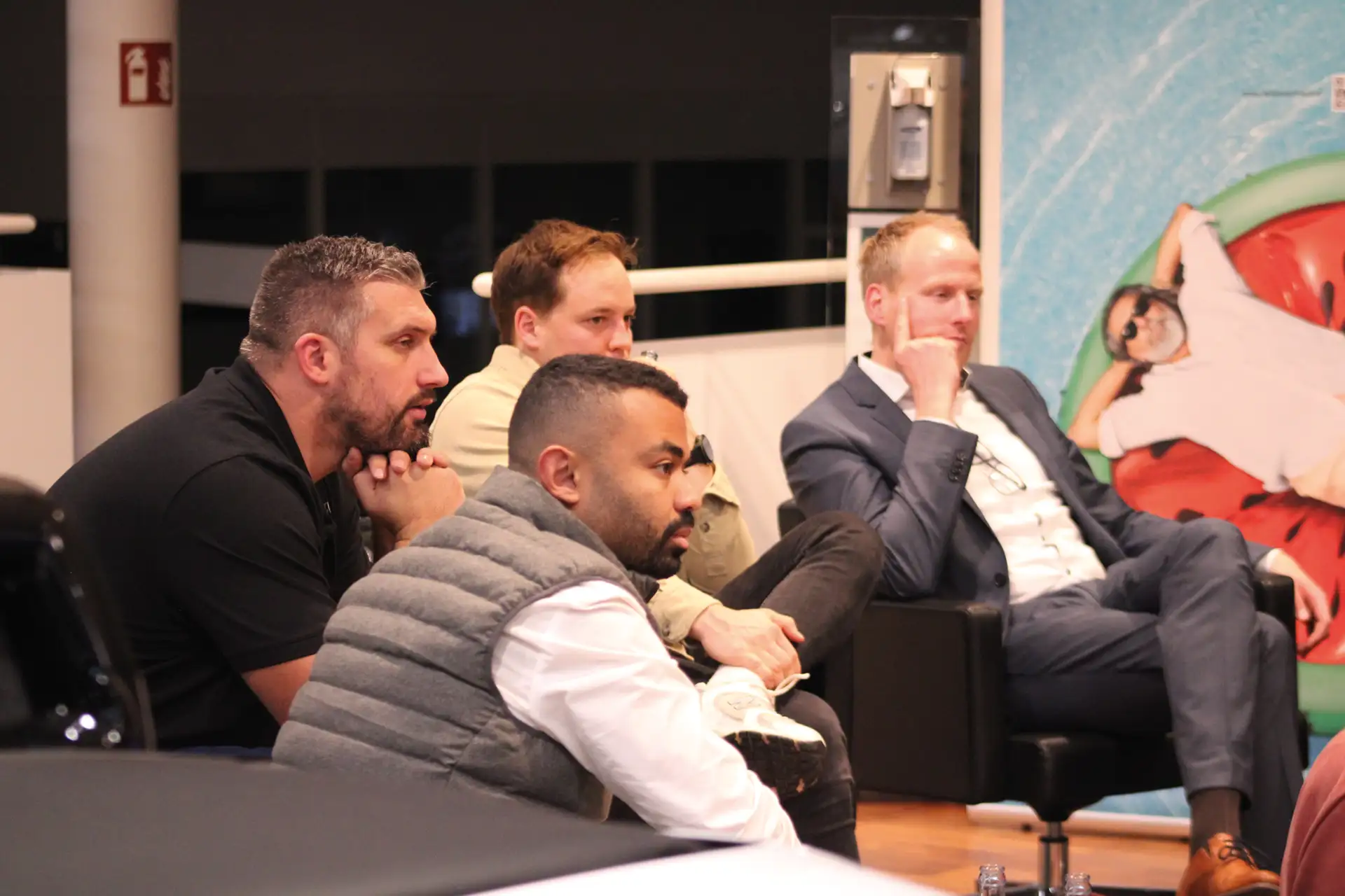 David Wrobel, Philip Schaub, Marian Metz und Yannik Gerland hören gebannt zu.